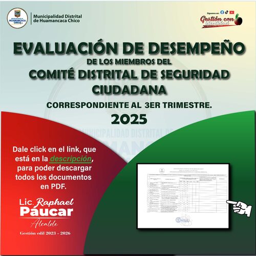 La Municipalidad Distrital de Huamancaca Chico informa a la ciudadanía que se ha realizado la Evaluación del desempeño de los miembros del Comité Distrital de Seguridad Ciudadana (CODISEC), correspondiente al III Trimestre del año 2025.