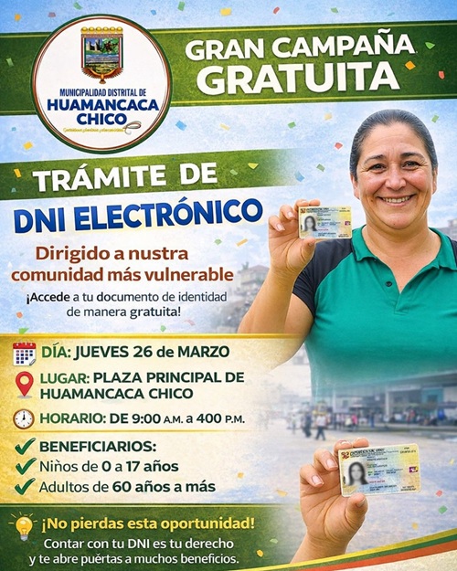 La Municipalidad Distrital de Huamancaca Chico, en coordinación con RENIEC, invita a toda la población a participar en esta gran jornada de documentación.