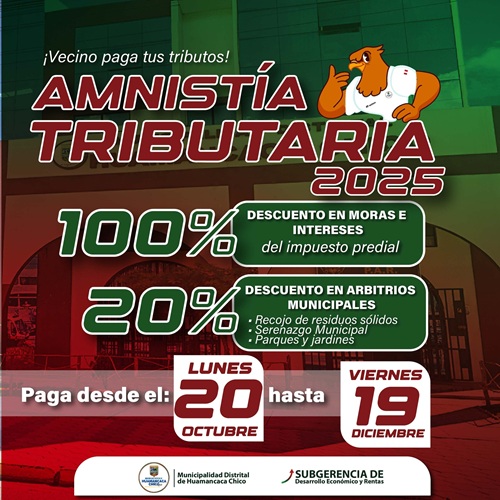 💚 CAMPAÑA DE AMNISTÍA 2025 – MUNICIPALIDAD DE HUAMANCACA CHICO Aprovecha la Campaña de Amnistía 2025 – Beneficios para Regularizar tus Tributos La Municipalidad Distrital de Huamancaca Chico invita a todos los vecinos a aprovechar la Campaña de Amnistía 2025 …